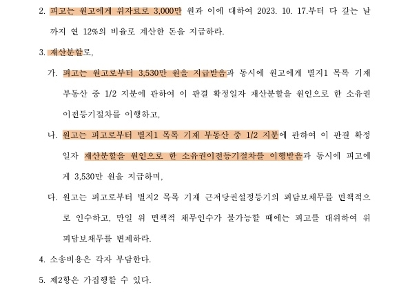 - 피고는 원고(의뢰인)에게 위자료 3,000만 원 지급 - 재산분할로, 피고는 원고로부터 3,530만 원을 지급받음과 동시에 원고에게 아파트 1/2 지분을 이전하고, 원고는 위 아파트 담보대출 채무를 인수. |
