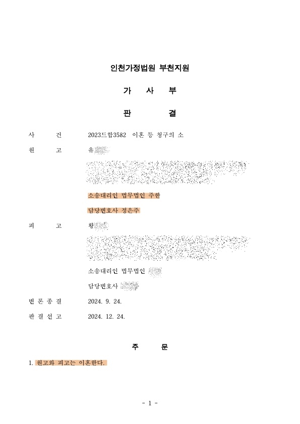 - 아내의 일방적인 각방 요구와 별거, 이혼 강요로 인하여 부부간 신뢰관계가 파탄되었고, 의뢰인은 저희 로펌에 의뢰하여 이혼소송을 제기함. - 소송기간 중 익명의 제보를 통하여 사실은 아내가 다른 남자와 부정행위를 저지르고 있었다는 사실이 새롭게 밝혀짐. 저희 로펌은 아내의 부정행위를 이혼사유로 추가하였고, 아내의 부정행위로 인하여 혼인이 회복할 수 없을 정도로 파탄된 경위를 상세히 주장, 입증하였음. - 재산분할로, 주로 의뢰인의 소득으로 재산을 형성하였고 의뢰인 부친이 재정적 지원을 하였으며, 아내는 의뢰인이 인수한 학원의 원장으로 일하면서 의뢰인으로부터 급여를 받았으므로 결국 아내의 소득도 의뢰인에게 기인하였다는 사실을 주장, 입증하였고, 의뢰인의 기여도를 55%로 인정받음. - 결과적으로, 아내로부터 위자료를 3,000만 원과 재산분할로 아파트 1/2 지분을 이전받고, 의뢰인이 아내에게 재산분할 정산금 3,530만 원을 지급하여 실 지급하는 금액이 거의 없이 공동명의 아파트를 의뢰인의 단독소유로 귀속시킬 수 있었음.