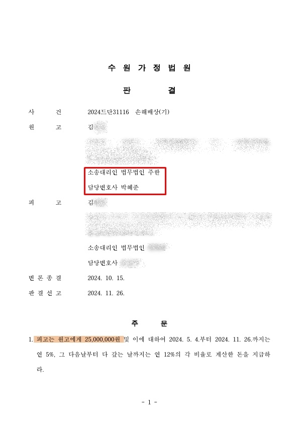 - 이후 다른 상간녀에 대해 위자료 2,500만 원의 화해권고결정이 확정됨. 위 사건들 모두 동일한 재판부에서 심리하여 공동불법행위자의 부진정연대채무의 법리에 따라 두 번째 상간녀에 대해서는 적은 위자료가 인정되거나 위자료가 기각될 우려가 있었으나, 적극적인 변론으로 결국 상간녀1.과 동일한 위자료 2,500만 원의 판결을 선고받은 사건임.