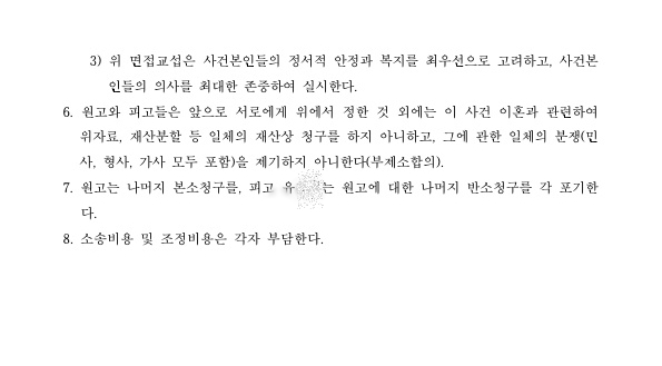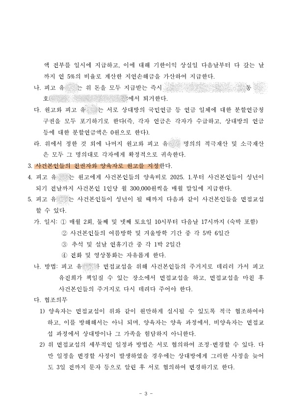 - 원고는 재산분할로 피고(의뢰인)에게 1억 4,000만 원을 지급하고 피고는 위 금원을 지급받는 즉시 퇴거한다. - 사건본인들 친권자 및 양육자는 원고로 지정하고, 피고는 양육비로 1인당 월 30만 원씩을 지급한다. |