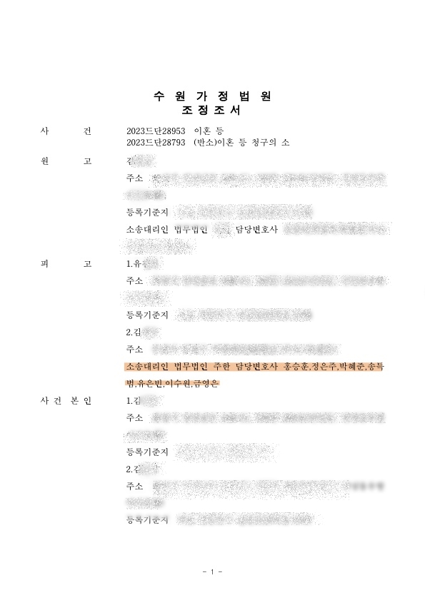 - 의뢰인(아내/ 원고)의 소송 접수와 거의 동시에 남편 역시 이혼 소장을 접수하여 본소, 반소로 함께 변론이 진행됨. 의뢰인은 약 17년의 혼인기간 동안 세 명의 자녀들을 낳아 기르며 가정을 꾸려오던 중 남편과의 갈등상황에서 회사 동료와 부정행위를 저질렀고 이 사실이 남편에게 발각됨. 남편은 의뢰인의 외도 사실을 가족, 친인척, 회사동료에게 모두 알리며 의뢰인을 사회적으로 매장시킴은 물론 심지어 자녀들 앞에서도 의뢰인의 외도사실을 언급하며 비하발언을 일삼음.