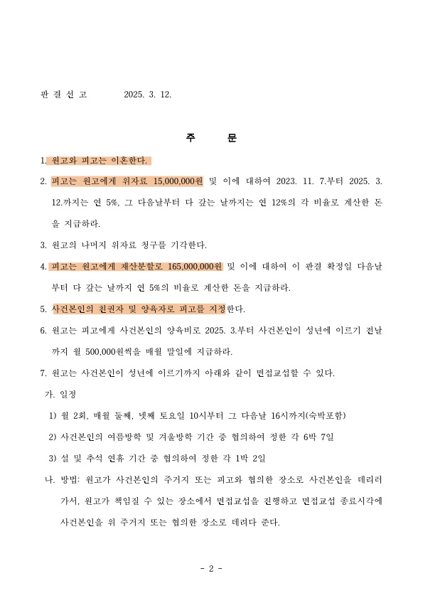 - 피고는 원고에게 위자료 15,000,000원 지급. - 피고는 원고에게 재산분할로 165,000,000원 지급. - 사건본인의 친권자 및 양육자로 피고를 지정. - 원고는 피고에게 사건본인의 양육비로 매월 500,000원씩 지급. |