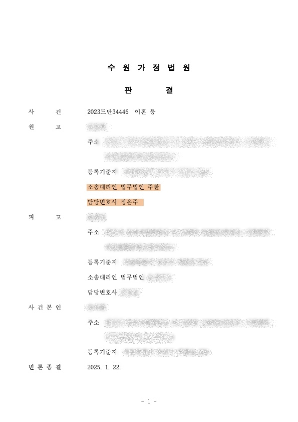 - 당시 의뢰인은 간호사로 야간 근무를 하며 두 자녀를 양육하고 있었고, 극심한 우울증과 불안으로 인해 수면제를 복용하고도 잠을 이루지 못하는 등 정신적으로 매우 불안정한 상태에 있었음. - 본 사건은 단순한 경제적 갈등이나 성격차이가 아닌, 반복적이고 명백한 유책사유에 해당하는 사안이었기 때문에, 법무법인 주한은 남편의 도박성 가상자산 투자와 그로 인한 채무를 부부공공재산에서 제외하거나, 최소한 남편의 재산분할기여도를 낮추는 방식으로 대응하기로 전략을 수립함. - 이에 따라 위자료로 3,000만 원을 청구하였고, 재판부는 남편의 자산 낭비 행위 및 혼인 파탄에 대한 책임을 일부 인정하여 1,500만 원을 인용하는 판결을 함. 이는 남편의 유책성이 인정됨과 동시에, 의뢰인이 혼인기간 동안 겪은 정신적 고통이 일정 부분 보상 받은 결과였음. - 재산분할 과정에서는 남편이 자의적으로 발생시킨 약 4억 9,000만 원 상당의 가상자산 투자로 인한 채무를 어떻게 평가할지가 핵심이었음. 법원은 해당 채무를 공동재산에서 명확히 제외하지는 않았지만, 해당 낭비성 지출을 고려해 남편의 기여도를 하락시켰고, 그 결과 의뢰인의 재산분할 기여도를 60%로 인정하였음. 이에 따라 의뢰인은 전체 공동재산 중 1억 6,500만 원을 재산분할금으로 지급받게 됨. - 법무법인 주한은 상담 초기에 설정한 전략과 목표를 끝까지 유지하며, 소송 중 반복된 감정적 충돌과 혼란 속에서도 의뢰인을 지지하고 이끌어 나갔음. 결과적으로 총 1억 8,000만 원 상당의 경제적 회복을 이루어 냈고, 특히 남편의 낭비성 채무에도 불구하고 의뢰인의 높은 재산분할 기여도 그리고 양육비 부담 최소화와 위자료 일부 인용이라는 이중의 결과를 모두 얻어냄.