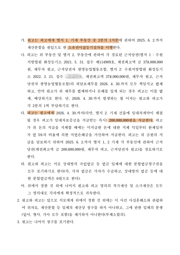 - 재산분할로, 원고(의뢰인)는 피고에게 별지1. 기재 부동산(대지) 중 2분의 1지분에 관하여 소유권이전등기절차를 이행, 피고는 위 부동산 및 별지2. 기재 부동산(주택)에 관하여 각 경료된 근저당권의 피담보채무를 모두 변제, 피고는 원고에게 2억 원을 지급, 서로 상대방의 분할연금청구권을 포기, 이 외에 나머지 재산은 모두 각자에게 귀속.